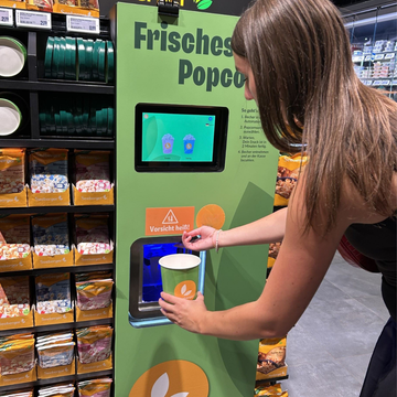 Im Rewe-Markt in der Hamburger HafenCity testen wir aktuell ein super-leckeres Pilotprojekt: eine Popcornmaschine, die frisches Popcorn, ganz ohne Öl oder Fett, direkt vor Ort zubereitet. Damit möchten wir zeigen, wie modernes Markenerlebnis aussehen kann.
