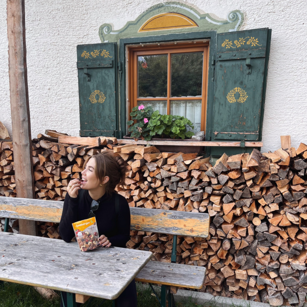 Frau sitzt lachend auf einer Bank und isst eine Nuss aus der Seeberger Packung
