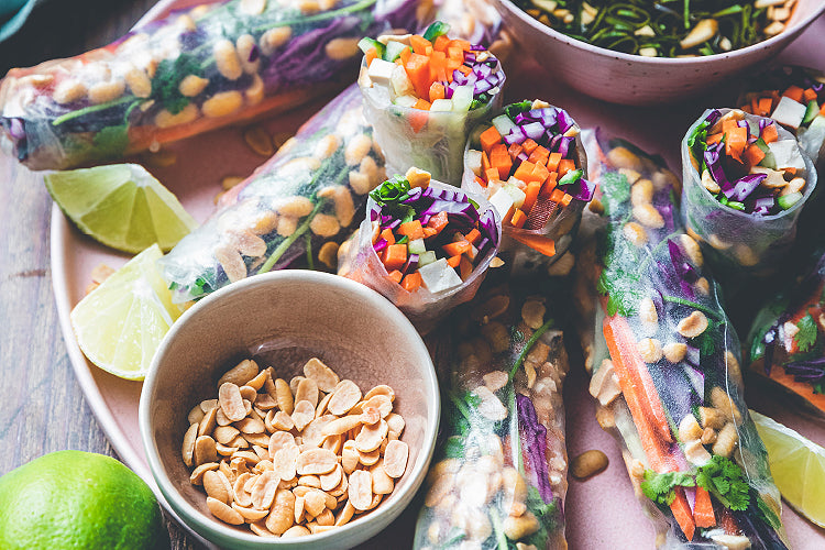 Je Rolle (reicht für insgesamt 12 Rollen) ein Blatt Reispapier unter fließendes Wasser halten und auf die Arbeitsfläche legen. Mittig mit etwa 1 TL Sojakernen bestreuen, anschließend länglich mit Koriander, Gemüse und Tofu belegen, dabei links und rechts etwa 3 cm und oben und unten 6 cm Platz lassen. Mit grob gehackten Cashewkernen bestreuen, Seiten einklappen und anschließend vorsichtig aber fest von unten her aufrollen.